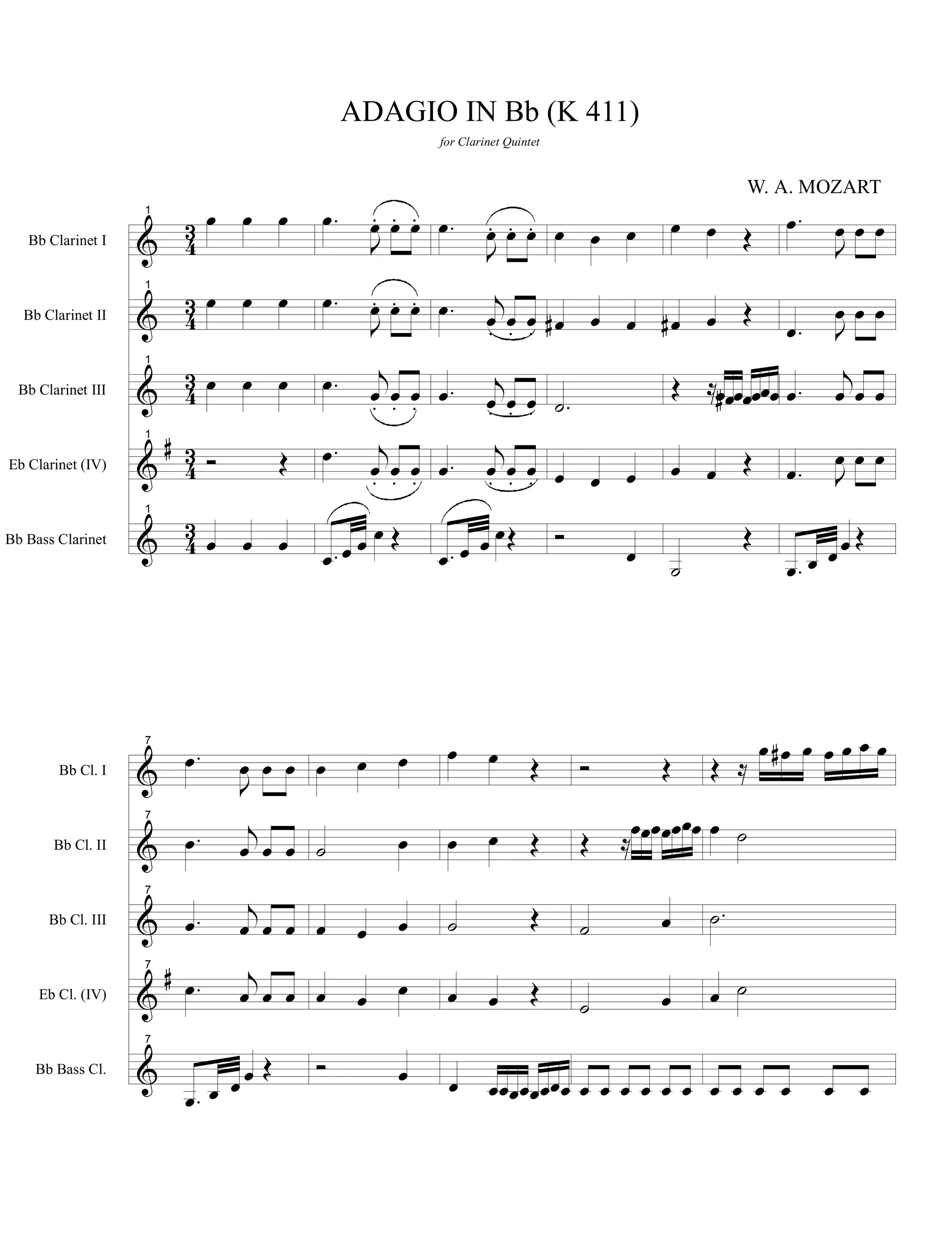 Le document présente une partition musicale de l'Adagio en si bémol (K. 411) pour quintette de clarinettes de W.A. Mozart. Il contient des notations détaillées pour plusieurs clarinettes, y compris des clarinettes en si bémol et en mi bémol. Les sections sont orchestrées avec des indications rythmiques et dynamiques pour chaque instrument.