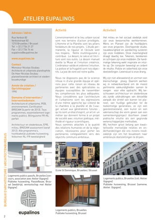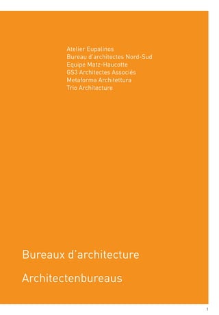 Le document présente plusieurs bureaux d'architectes basés à Bruxelles, chacun ayant une approche unique et des domaines d'intervention variés, notamment l'architecture, l'urbanisme et l'éco-construction. Les fondateurs de ces agences mettent l'accent sur des valeurs telles que la qualité des relations humaines, l'écoute, la création durable et adaptée aux besoins des utilisateurs. Les projets incluent des constructions publiques, des réhabilitations et des innovations architecturales visant à améliorer la qualité de vie et l'environnement.