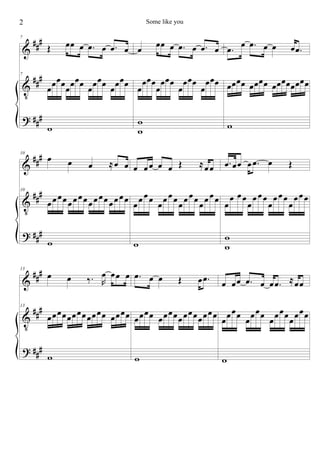 Le document semble contenir des informations musicales, probablement des transcriptions de la chanson 'Someone Like You' d'Adele, incluant des notations et des accords pour le piano. Des références à des mélodies, des accords et des instructions de performance y sont présentes. Cependant, le contenu est fortement désordonné et peu lisible, rendant la compréhension difficile.