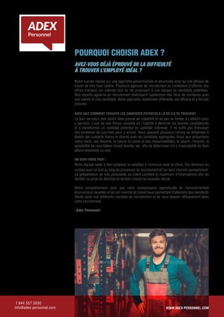 Adex offre une approche personnalisée et structurée pour le recrutement, privilégiant les relations de confiance avec clients et candidats. Les coûts d'un mauvais recrutement sont élevés, engendrant perte de productivité et mécontentement au sein de l'entreprise. Investir dans des services de recrutement de qualité permet de rentabiliser rapidement le processus par l'apport d'employés clés.