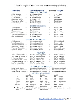 Le document traite des adjectifs possessifs en français, leur utilisation et leur accord selon le genre et le nombre. Il fournit des exemples d'utilisation à la première, deuxième et troisième personne, ainsi que des exercices pratiques. La structure et les règles grammaticales simples sont expliquées pour aider à comprendre la possession en français.