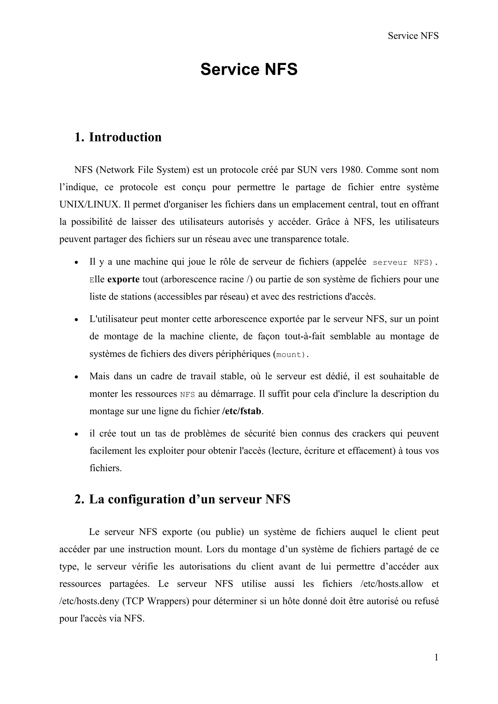 NFS (Network File System) est un protocole permettant le partage de fichiers entre systèmes Unix/Linux, utilisant un serveur pour exporter des systèmes de fichiers que les clients peuvent monter. La configuration des exportations se fait via le fichier /etc/exports et les commandes comme exportfs, tandis que les clients montent les répertoires partagés manuellement ou au démarrage via /etc/fstab. NFS soulève des préoccupations de sécurité nécessitant des attentions particulières dans les options d'exportation et de montage.