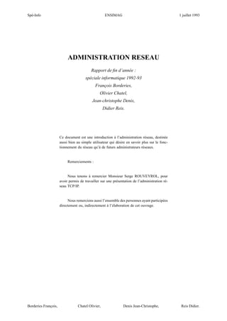 Ce document est un rapport d'introduction à l'administration réseau, spécifiquement sur le protocole TCP/IP. Il aborde l'historique, l'architecture et les spécificités de TCP/IP, les couches de communication, ainsi que les protocoles de transport et d'application associés. Le texte souligne l'importance croissante d'Internet et la diversité des services basés sur ce protocole.