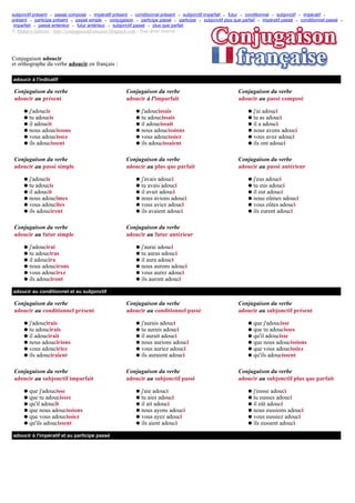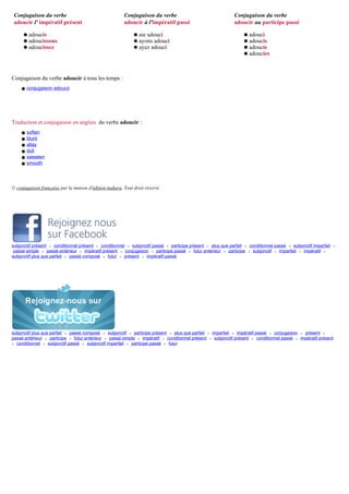 Le document présente la conjugaison du verbe 'adoucir' en français à travers différents temps comme l'indicatif, le conditionnel, et le subjonctif. Il inclut des exemples concrets de conjugaison pour chaque temps ainsi que des traductions en anglais. Les informations sont structurées de manière à aider à comprendre la conjugaison et l'usage du verbe dans divers contextes.