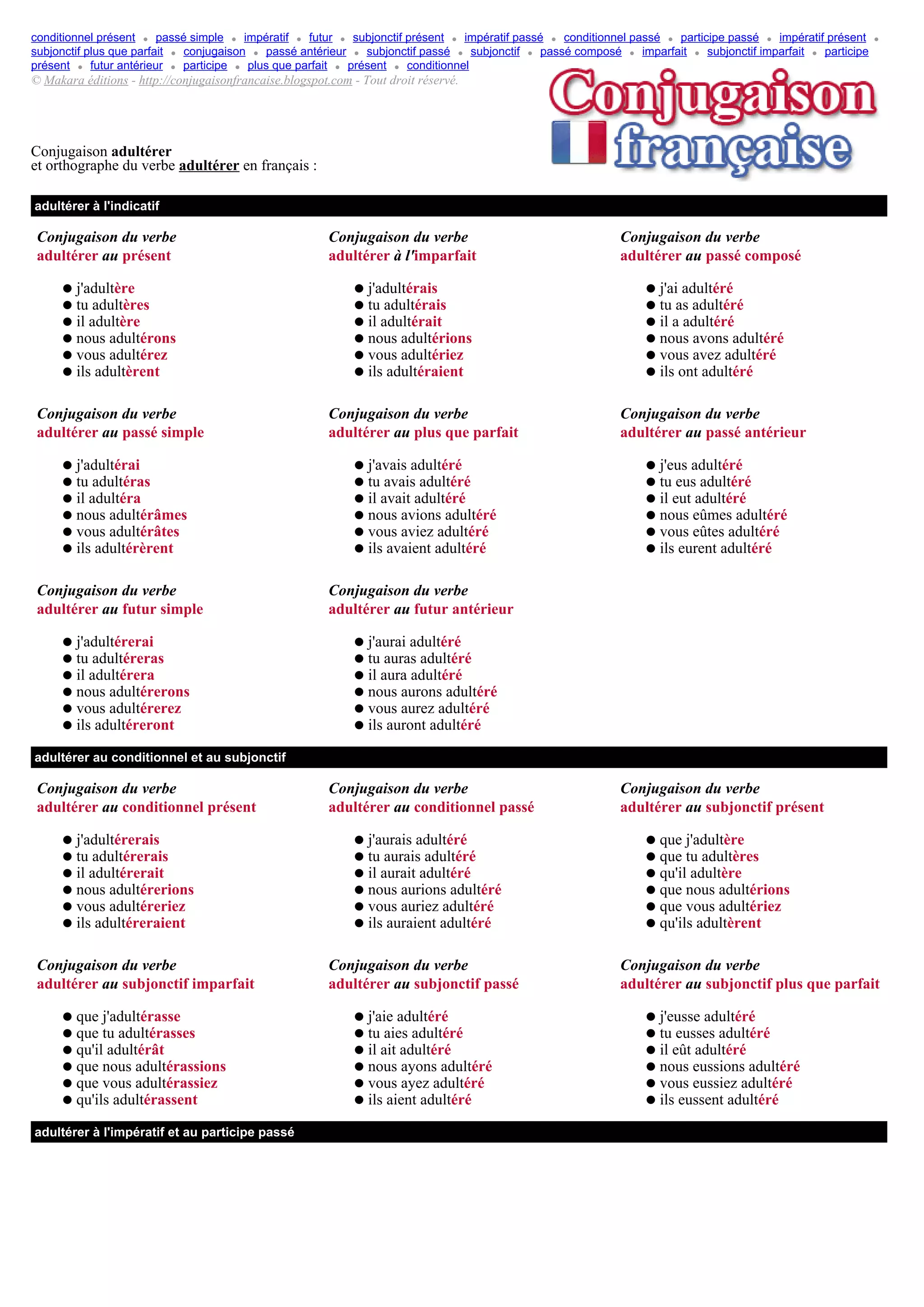 Le document présente la conjugaison du verbe 'adultérer' en français à travers divers temps grammaticaux tels que le présent, passé, futur, et différents modes comme l'indicatif, le subjonctif et l'impératif. Il fournit des exemples de conjugaison pour chaque temps, y compris les formes au conditionnel et au participe. De plus, une mention est faite de la traduction du verbe en anglais.