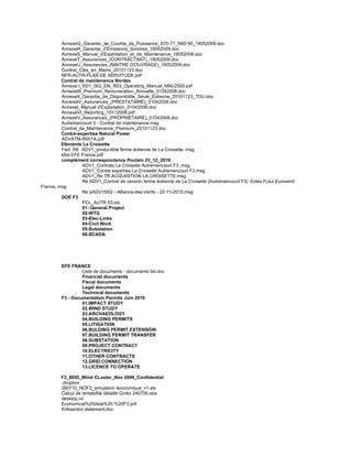 Le document est une liste exhaustive de fichiers relatifs à la ferme éolienne de la Croisette et à d'autres projets associés, incluant des contrats, des rapports financiers, des documents techniques et des données de production. Il contient également des évaluations économiques, des certificats de complétion et divers documents administratifs essentiels. Ces informations sont cruciales pour la gestion et l'exploitation de la ferme éolienne ainsi que pour la prise de décision stratégique.