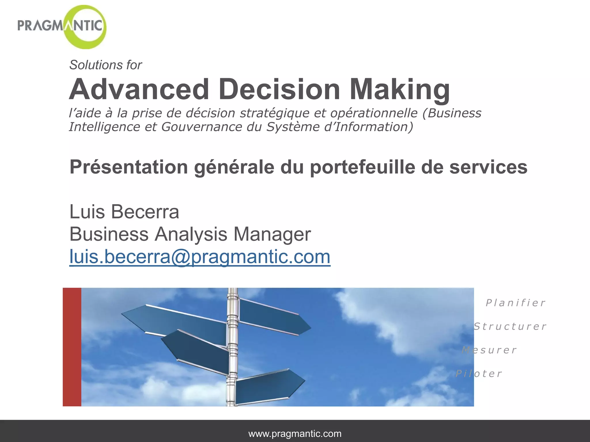 Pragmantic offre des solutions en gouvernance des systèmes d'information et business intelligence, visant à améliorer la prise de décision stratégique et opérationnelle pour les entreprises. Leur portefeuille de services inclut le pilotage de projets, la gestion de l'innovation, et l'évaluation de la maturité des processus informatisés, tout en garantissant une cohérence dans les applications et une alianza avec les objectifs métier. Avec une équipe de consultants expérimentés, Pragmantic se concentre sur l'écoute des besoins des clients pour fournir des solutions concrètes et adaptées.