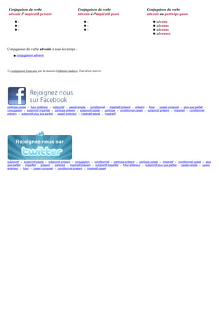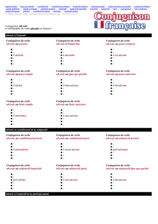 Le document présente la conjugaison du verbe 'advenir' à différents temps et modes en français, incluant l'indicatif, le conditionnel, le subjonctif, et l'impératif. Il inclut des formes telles que le passé simple, le futur composé, et le participe passé. La source est un site internet dédié à la conjugaison française, publié par Makara Éditions.