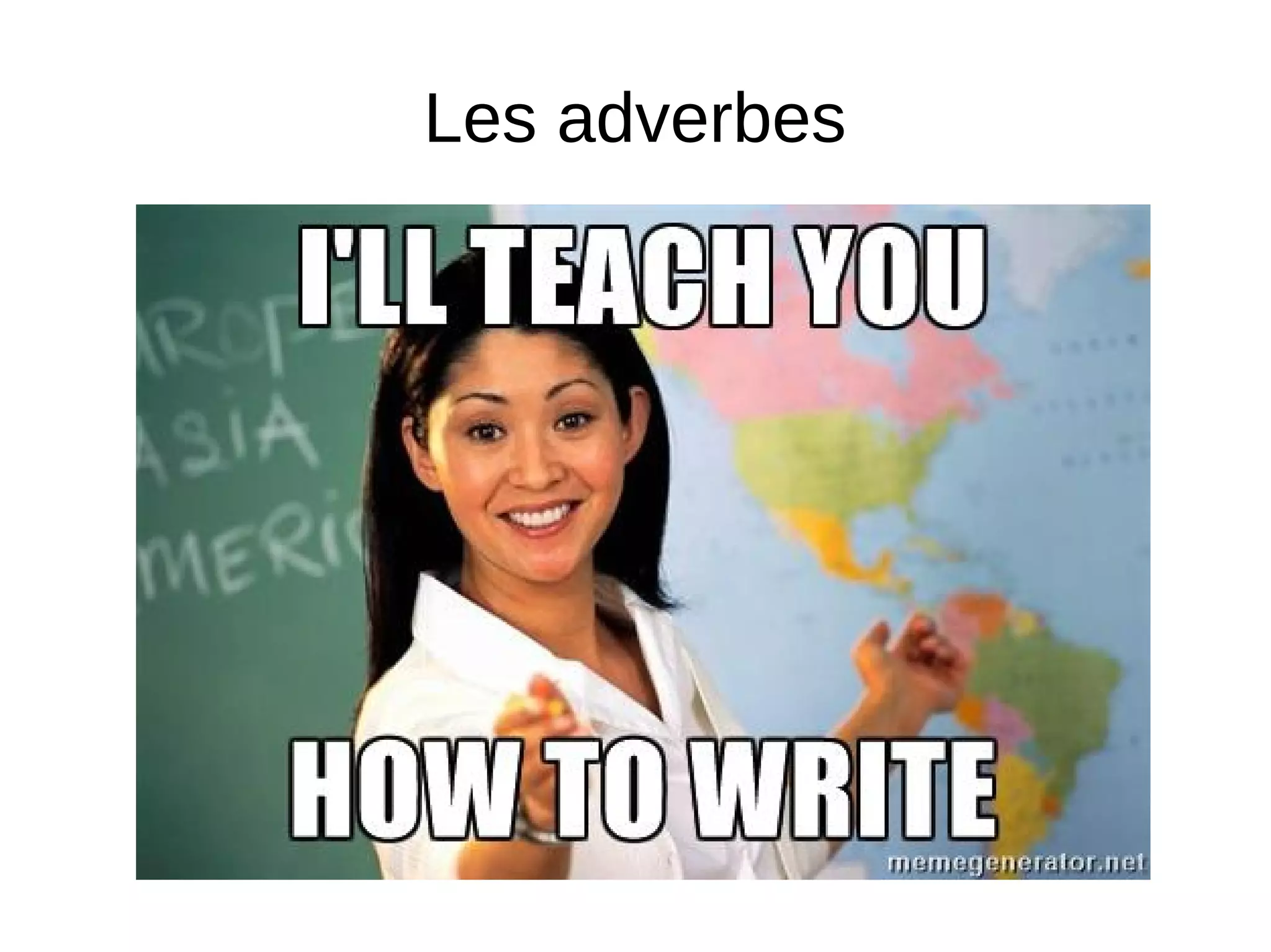 L'adverbe est un mot invariable qui modifie le sens d'un verbe, d'un adjectif ou d'un autre adverbe. Il existe des règles spécifiques pour la formation des adverbes en -ment, en fonction du genre et de la terminaison des adjectifs. Le document donne également des exemples de prononciation et mentionne des adverbes simples et composés.