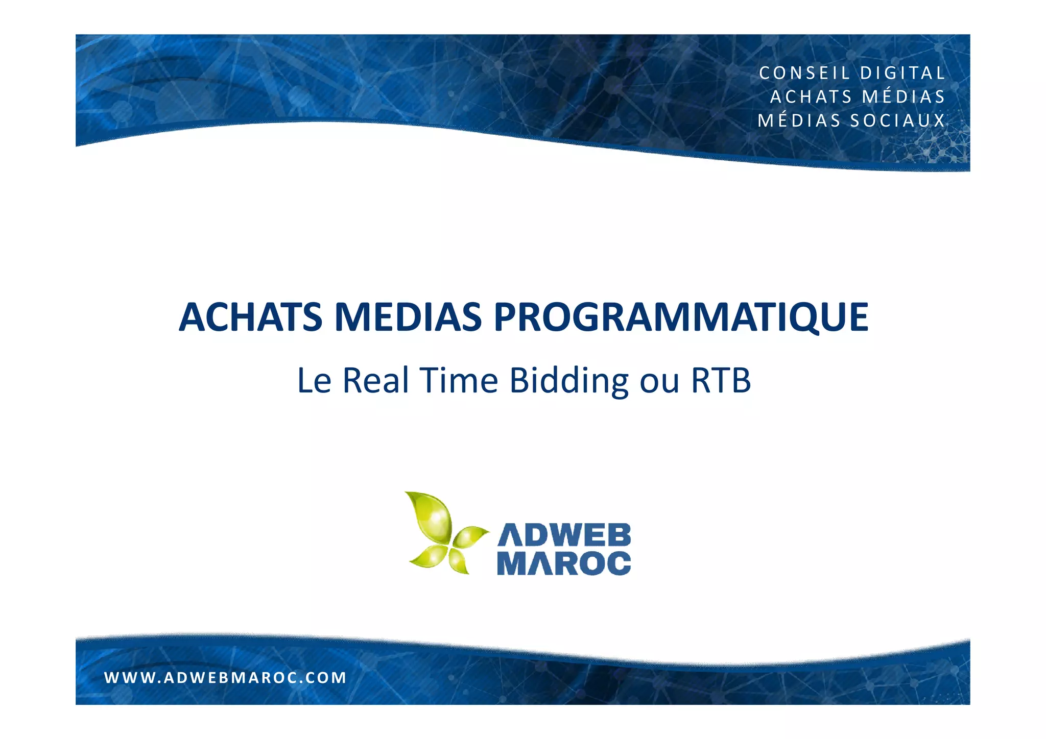 Le document explique le fonctionnement de la publicité programmatique et du Real-Time Bidding (RTB), un processus d'achat d'espaces publicitaires automatisé. Il présente les avantages de la programmatique, tels que la sensibilisation à la marque, la génération de prospects et la connaissance des marchés, ainsi que les composants clés pour atteindre des objectifs commerciaux grâce à des stratégies d'achat et de ciblage. En outre, il détaille l'écosystème des plateformes impliquées, y compris les Supply Side Platforms (SSP) et les Demand Side Platforms (DSP).
