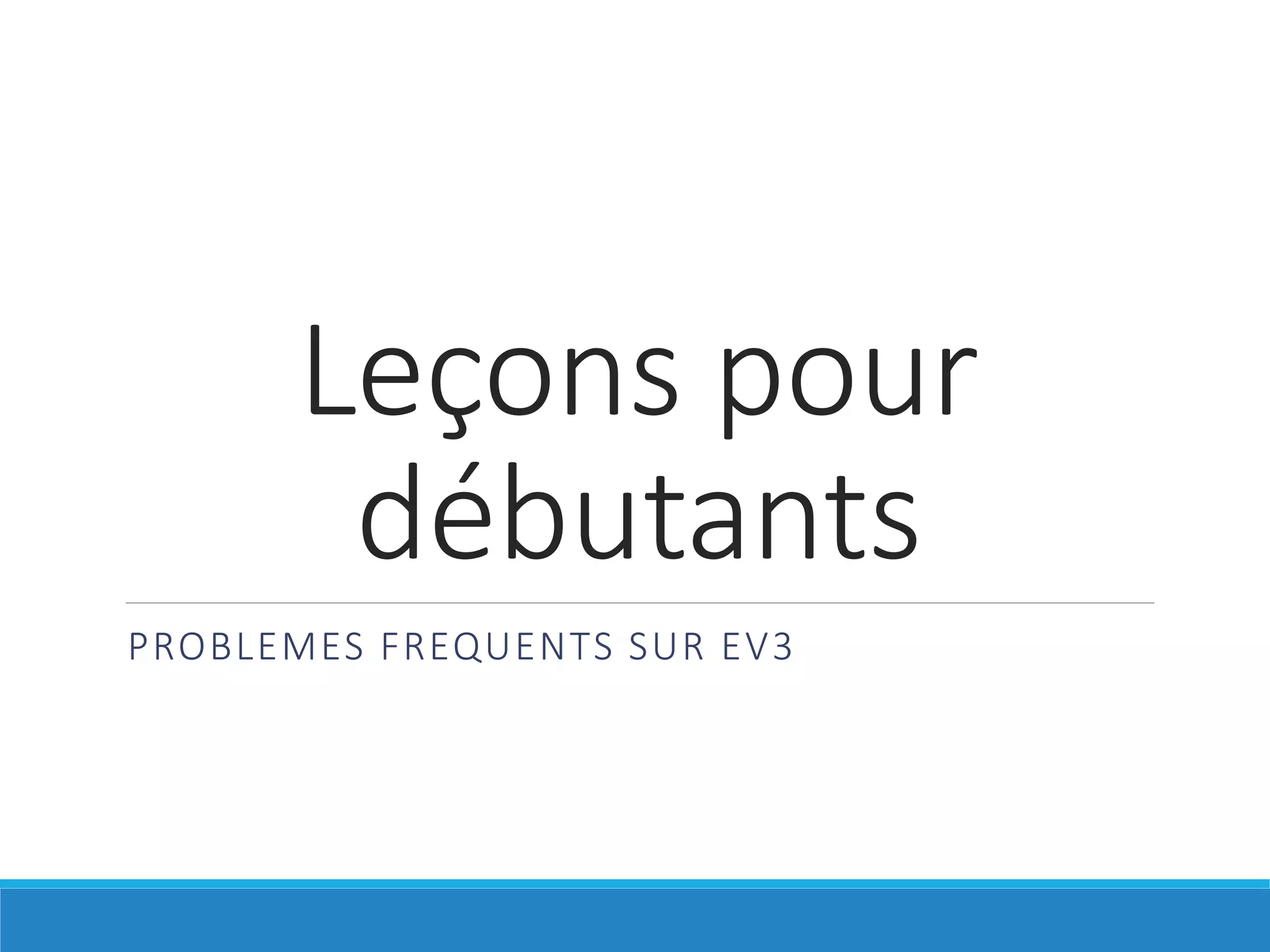 Ce document fournit des solutions aux problèmes courants liés à la brique EV3, notamment des instructions pour réinitialiser la brique en cas de gel et des méthodes pour mettre à jour le firmware. Il aborde également des problèmes de batterie, de boutons bloqués et de récupération de programmes supprimés. Des vidéos et des ressources sont mentionnées pour une aide supplémentaire.
