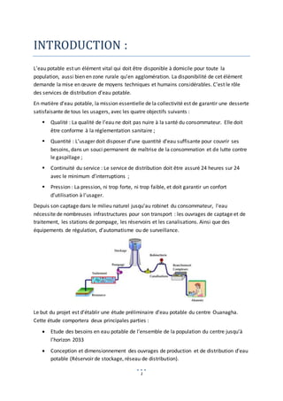 Le document présente une étude préliminaire sur l'approvisionnement en eau potable pour le centre Ouanagha, incluant l'estimation de la population et les besoins en eau jusqu'en 2033. Il détaille le dimensionnement des infrastructures nécessaires, telles que les réservoirs et les conduites d'adduction, pour garantir un service de qualité, en quantité suffisante et avec une pression adéquate. Les analyses incluent des prévisions de consommation et des méthodes de calcul pour le développement d'un réseau de distribution efficace.