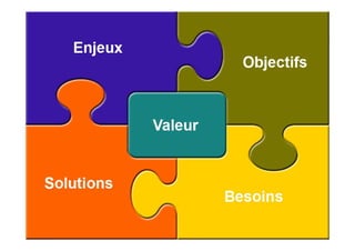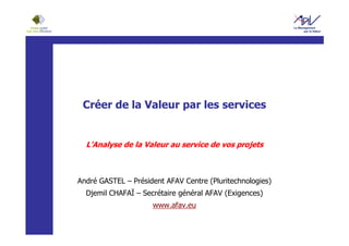 Le document traite de la création de valeur à travers l'analyse des services et des produits, soulignant l'importance de soutenir le besoin client dans un contexte économique évolutif. Il insiste sur la nécessité de réduire les coûts tout en respectant les exigences de qualité et en maximisant la valeur créée pour les entreprises. L'approche proposée inclut une méthodologie structurée pour établir des cahiers des charges, définir des solutions potentielles et gérer les parties prenantes dans le but d'optimiser la création de valeur.