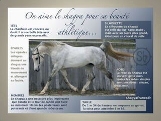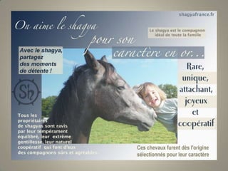 Le document présente l'Association Française du Cheval Shagya (AFCAS), qui promeut la race de chevaux shagya en France, avec un cheptel en plein essor et une reconnaissance internationale. Il met en avant les succès des chevaux shagya français dans des compétitions d'endurance et l'implication de l'association dans la communication et le développement de partenariats. L'AFCAS, fondée en 1987, vise à renforcer sa présence à l'international et à attirer de nouveaux partenaires pour soutenir ses activités.