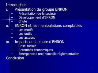 Le document traite du scandale Enron, détaillant la présentation de la société, ses manipulations comptables, et les impacts de sa chute, notamment sur l'économie, le secteur social et le secteur bancaire. La faillite d'Enron a entraîné une perte massive d'emplois, des milliards de dollars de dettes et une crise de confiance envers les entreprises américaines. En réponse, la loi Sarbanes-Oxley a été instaurée, visant à renforcer la réglementation comptable et la transparence des entreprises.