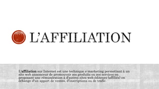 Ce document présente des ressources et formations sur l'affiliation en ligne, un e-marketing permettant d'obtenir des commissions en promouvant des produits d'autres sites. Il propose des outils, des stratégies et des guides pour réussir dans l'affiliation, y compris la création de blogs professionnels et l'utilisation de templates optimisés. Plusieurs liens sont fournis pour accéder à des ebooks et formations afin de générer des revenus significatifs grâce à cette méthode.