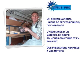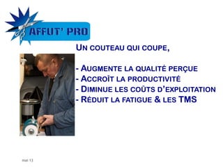 Le document présente les services d'affûtage mobile offerts par Affut'Pro, soulignant l'importance d'un bon affûtage pour améliorer la productivité, réduire les coûts et minimiser les accidents de travail dans les filières de la viande et de la cuisine. Il met en évidence les bénéfices d'un entretien régulier des outils de coupe, comme la longévité des couteaux et la diminution des troubles musculo-squelettiques. Enfin, il propose des tarifs et des forfaits d'affûtage, ainsi que des sessions de formation pour sensibiliser les employés aux bonnes pratiques.