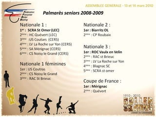 Le rapport aborde la mise en place d'un module de résultat pour la gestion des compétitions de rink hockey, permettant une meilleure saisie des données par les clubs et le calcul des classements. Il évoque également la nécessité de refondre les championnats pour alléger les calendriers, maintenir des niveaux d'élite et optimiser les coûts de déplacement. Plusieurs propositions ont été soumises pour redéfinir le fonctionnement des différentes divisions, y compris la création de nouvelles poules et la nomenclature des divisions.