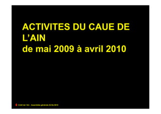 La réunion de l'assemblée générale du CAUE de l'Ain, tenue le 25 juin 2010, a présenté les activités du CAUE entre mai 2009 et avril 2010. Divers conseils aux particuliers, projets d'urbanisme et collaborations avec des architectes ont été abordés, notamment à Divonne-les-Bains. Des salons et événements régionaux ont également été mentionnés, soulignant l'engagement du CAUE dans la sensibilisation et l'accompagnement des collectivités.