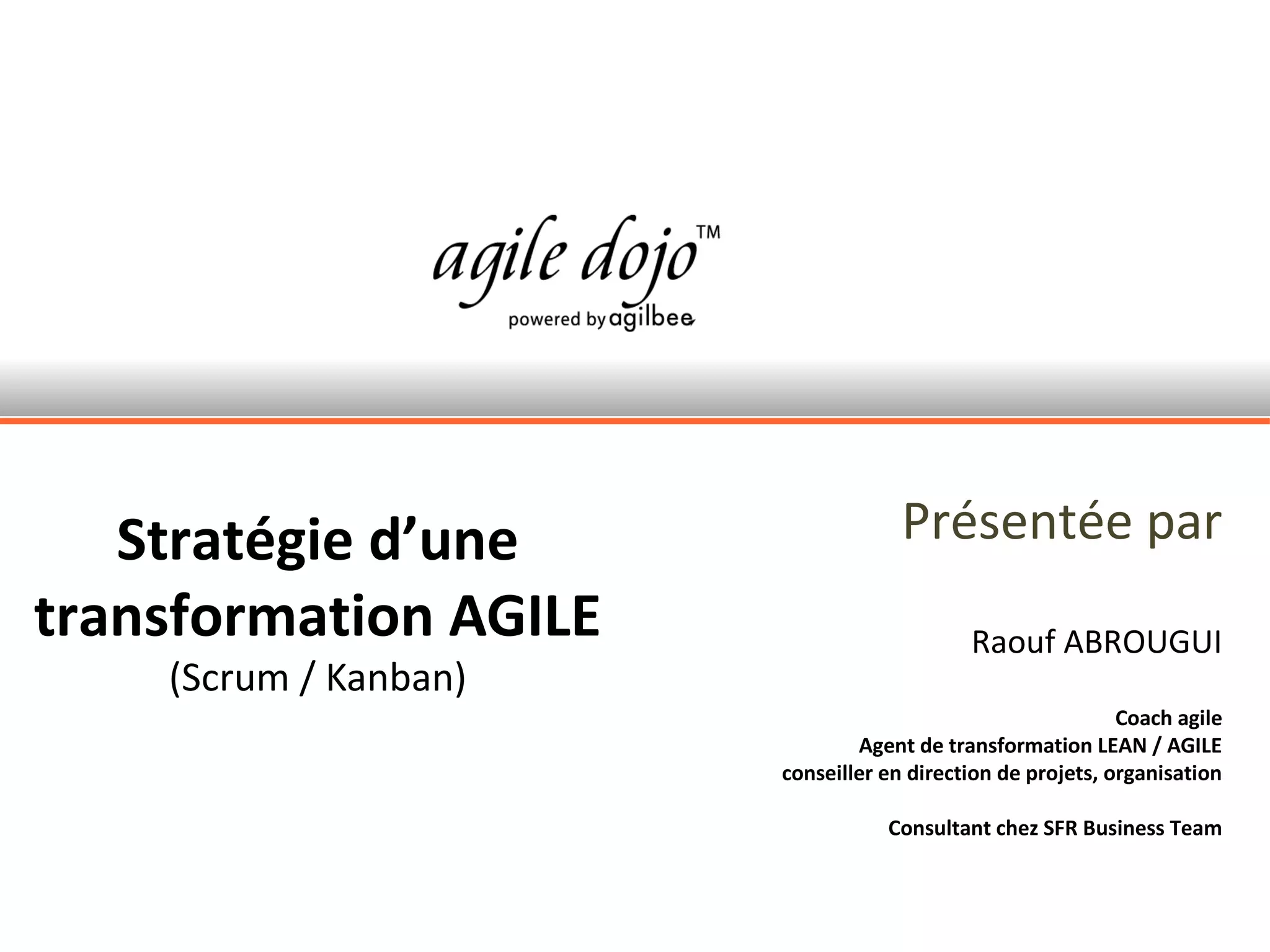Raouf Abrougui présente une stratégie pour une transformation agile, soulignant l'importance de comprendre le contexte organisationnel avant de déployer des méthodologies comme Scrum ou Kanban. Les échecs sont souvent provoqués par des résistances internes et un manque de soutien, tandis que la transformation agile vise à améliorer la flexibilité, la qualité du travail, et la culture de l'amélioration continue. Il est recommandé de commencer par un projet pilote et d'impliquer activement l'équipe dans le processus de changement.