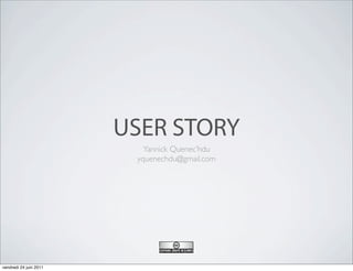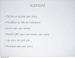 Le document explique la création et l'importance des user stories dans le développement agile, en détaillant leur structure, les rôles des utilisateurs, et les techniques à utiliser pour les rédiger efficacement. Il met en évidence l'importance d'une documentation de qualité pour éviter les échecs de projet et propose des approches pour modéliser les utilisateurs et leurs besoins. En outre, il décrit des critères pour évaluer la qualité des user stories, tels que leur indépendance, leur négociabilité, leur valeur, leur estimabilité et leur taille.