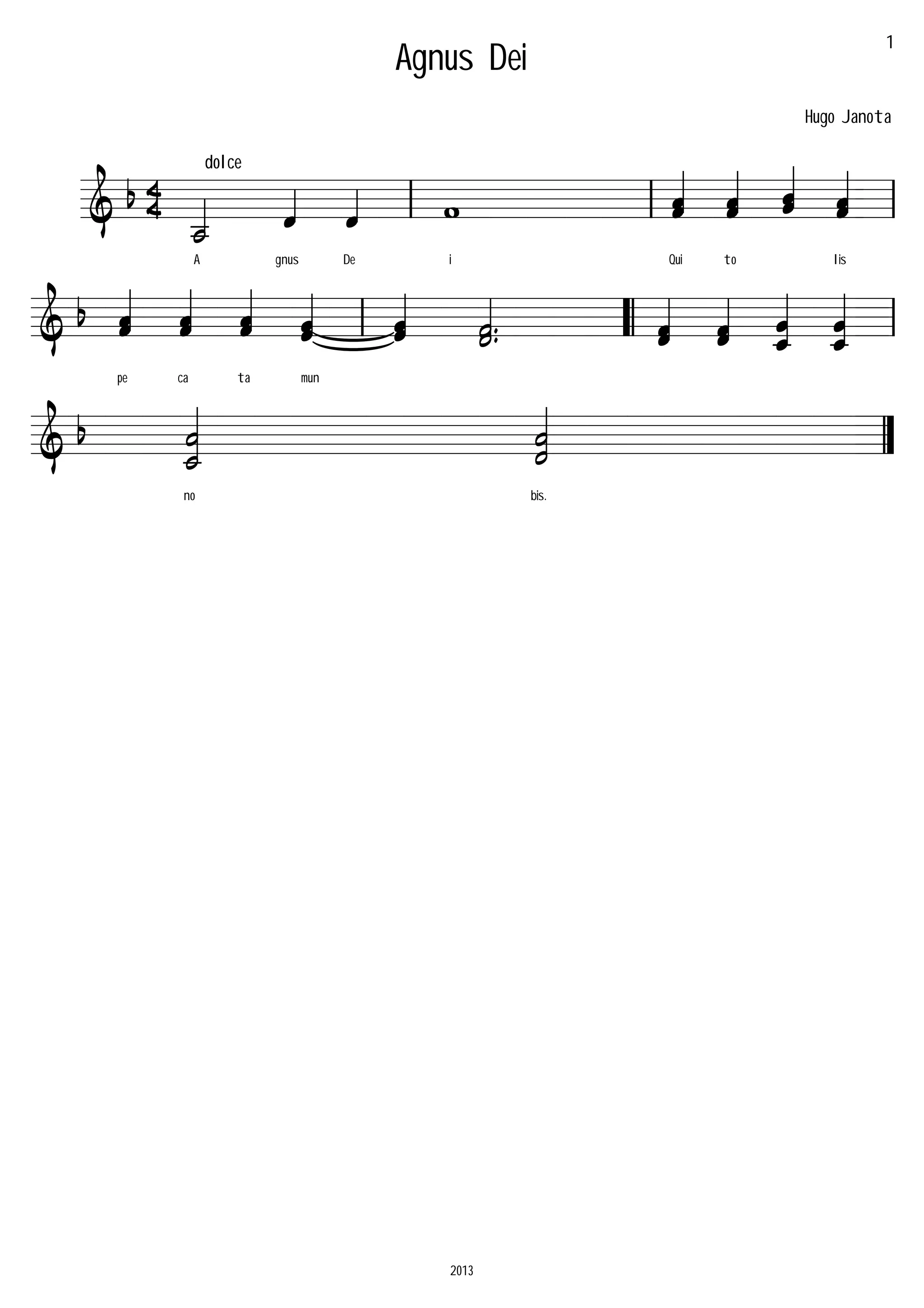 Le document semble être une composition musicale ou un arrangement intitulé 'Agnus Dei' réalisé par Hugo Janota. Il contient des éléments musicaux notés et des signes indicatifs, probablement destinés à la performance. Les notations peuvent faire référence à des sections spécifiques ou des interprétations de la pièce.