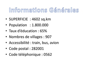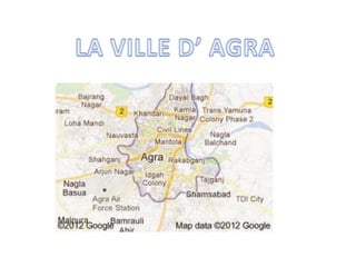 Agra, une ville historique en Inde, couvre une superficie de 4602 km² et compte 1,8 million d'habitants. Elle est célèbre pour le Taj Mahal, édifié par Shah Jahan, et l'Agra Fort, emblèmes de l'architecture moghole, attirant des touristes pour leur grandeur et leur histoire. La ville, située aux rives de la rivière Yamuna, connaît un climat continental avec des étés très chauds et des hivers froids.