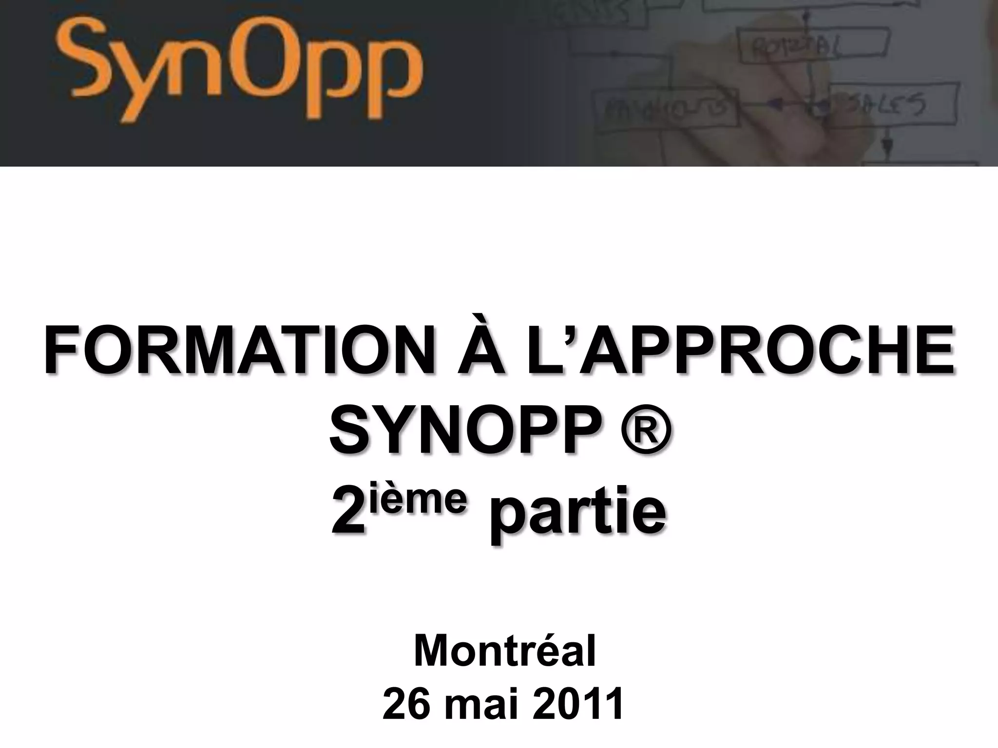 La formation synopp ® de Montréal, tenue le 26 mai 2011, aborde divers thèmes tels que la définition des adeptes, le risque et la sensibilité à la perte, ainsi que la création et la présentation d'un plan d'affaires. Elle inclut également des stratégies de guérilla marketing et des questions critiques à considérer dans un plan d'affaires. Les participants rapportent une amélioration de leurs conseils et une nouvelle perception de l'application des connaissances acquises.