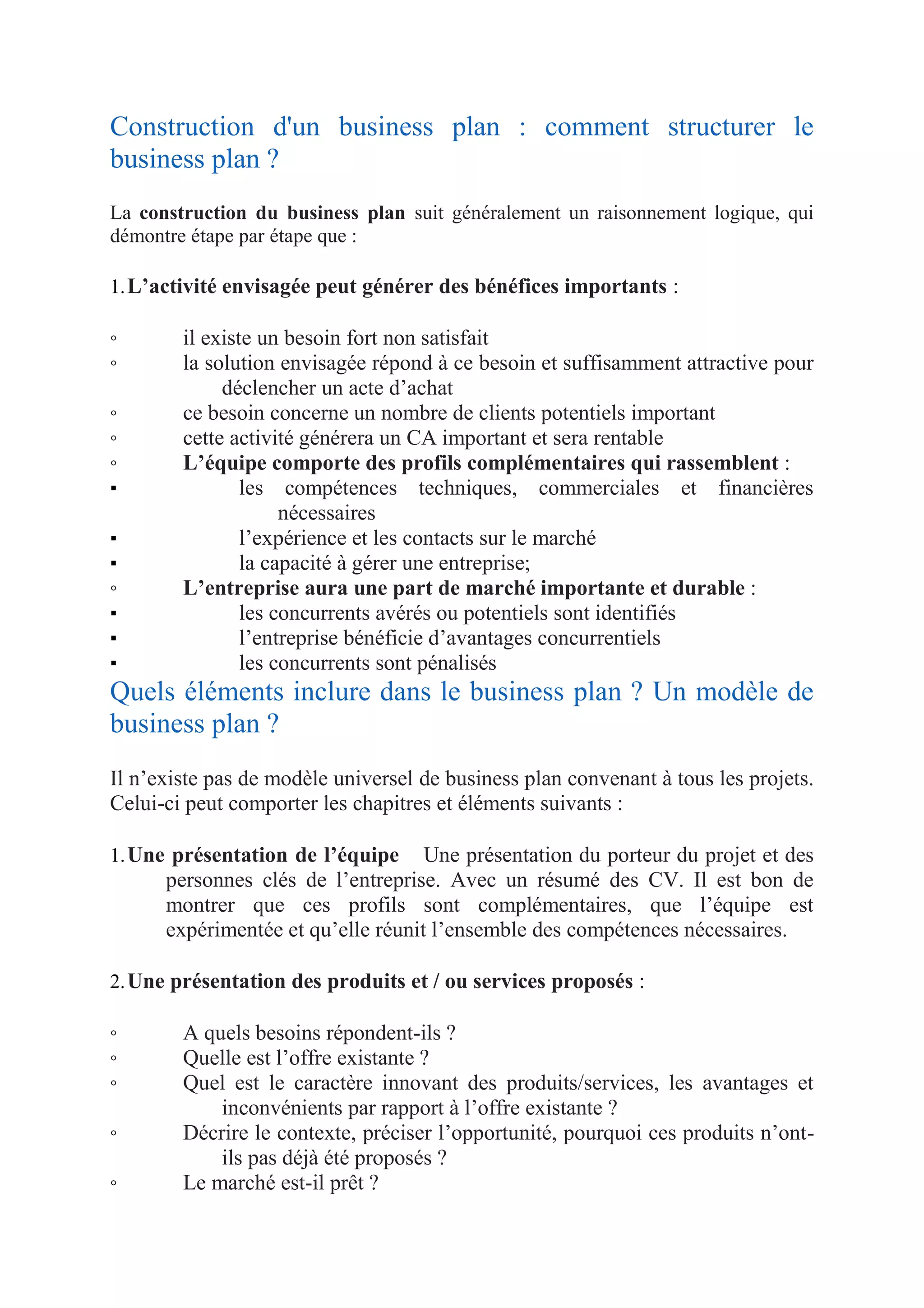 Le document traite de la construction d'un business plan, en détaillant la structure et les éléments essentiels à inclure pour démontrer la viabilité et la rentabilité d'une activité. Les sections clés incluent la présentation de l'équipe, des produits ou services proposés, l'analyse du marché, le modèle économique, la concurrence, le plan d'action, les prévisions financières, et les opportunités d'investissement. Une approche logique et détaillée est essentielle pour convaincre les parties prenantes de la solidité du projet.