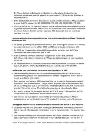 Entre 2001 et 2009, le nombre de nouvelles infections par le VIH en Afrique subsaharienne a diminué de 18%, avec des baisses significatives dans plusieurs pays, bien que la région continue de supporter la majorité de la charge mondiale du VIH. L'accès accru aux traitements antirétroviraux a entraîné une baisse des décès liés au sida, notamment au Botswana et au Kenya, où de nombreux décès infantiles ont également diminué. Toutefois, les femmes et les filles restent particulièrement vulnérables, représentant 76% des femmes vivant avec le VIH dans le monde.