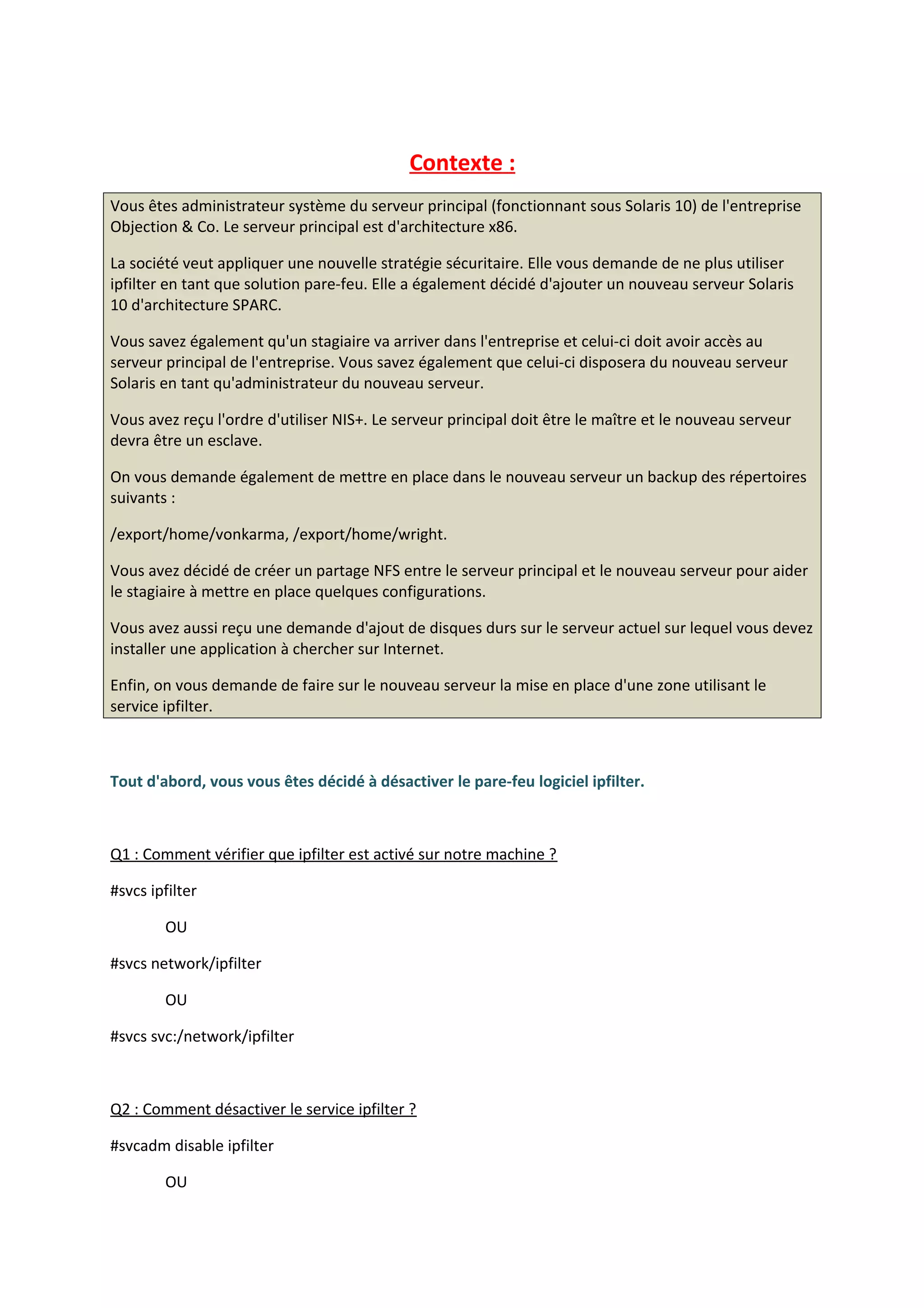 L'administrateur système de l'entreprise Objection & Co. doit mettre en œuvre une nouvelle stratégie de sécurité en désactivant ipfilter et en configurant un nouveau serveur Solaris 10 tout en intégrant les fonctionnalités NIS+. Il doit également effectuer des sauvegardes sur des répertoires spécifiques, gérer l'ajout de disques durs, et s'assurer que le stagiaire a accès à toutes les ressources nécessaires, y compris la mise en place du réseau. Enfin, il doit assister ce stagiaire dans l'installation de Solaris 10 sur un nouveau serveur d'architecture Sparc.