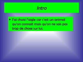 Le document fournit des informations détaillées sur l'aigle, un oiseau de la famille des accipitridés, décrivant ses caractéristiques physiques, son habitat, sa nourriture et son rôle dans la chaîne alimentaire. Il souligne que l'aigle, avec une longévité de 35-40 ans, vit en Asie et en Amérique du Nord, se nourrissant principalement de gros mammifères. L'auteur exprime sa surprise quant à la capacité de l'aigle à chasser de grands animaux tels que le bouquetin et le chevreuil.