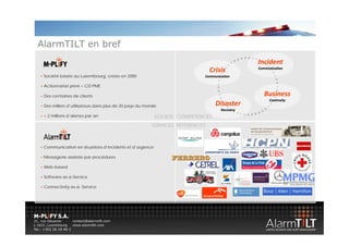 Alarmtilt est une solution de gestion d'alertes utilisée pour la communication en cas de crise et d'urgence, déployée dans plus de 20 pays avec des milliers d'utilisateurs. La société offre divers services aux ministères et autorités pour répondre à des incidents tels que des catastrophes naturelles, en mobilisant rapidement le personnel concerné. Alarmtilt évolue techniquement avec des fonctionnalités de gestion de crise afin de s'adapter à des situations exceptionnelles.