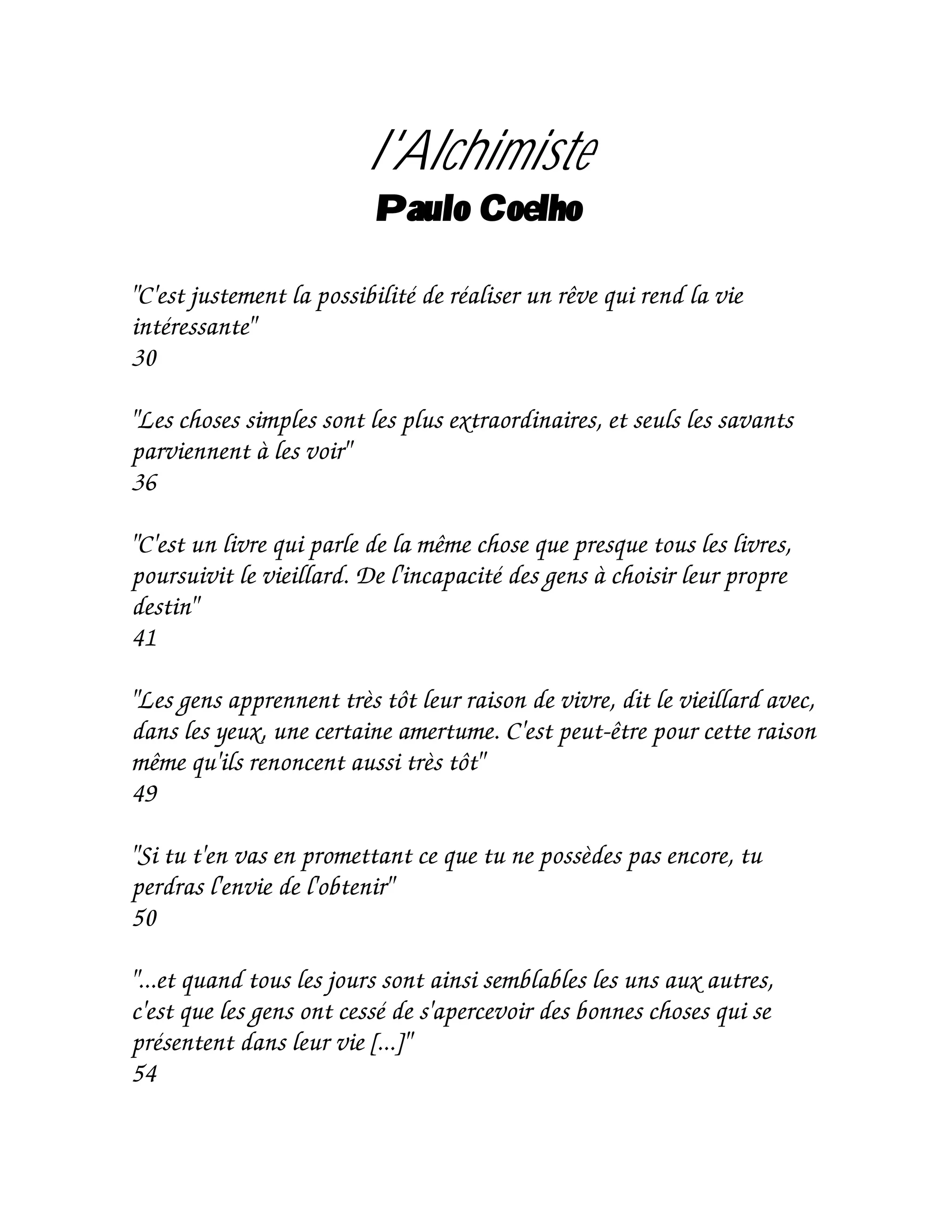 Le livre 'L'Alchimiste' de Paulo Coelho explore la quête de soi et la poursuite des rêves, soulignant l'importance de vivre dans le présent et d'écouter son cœur. Il évoque la beauté des choses simples et l'impact de l'amour sur notre vie et nos choix. En fin de compte, il rappelle que chaque individu a un rôle essentiel à jouer dans l'histoire du monde, souvent sans en être conscient.