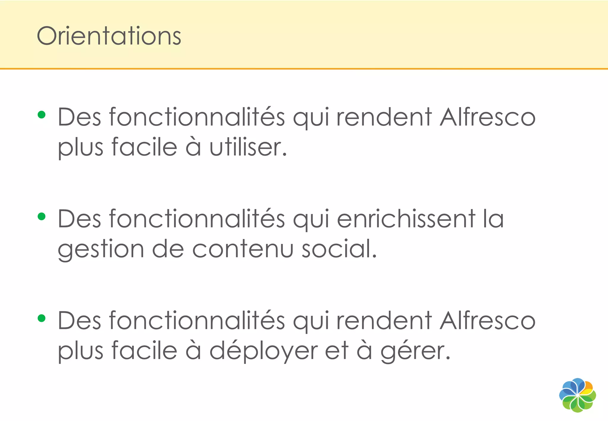 Alfresco 4.0 introduit de nouvelles fonctionnalités pour améliorer l'expérience utilisateur, la gestion de contenu social et l'administration des sites, y compris le glisser-déposer du contenu, des notifications personnalisables et l'intégration avec des plateformes externes comme Google Docs et les réseaux sociaux. De plus, un serveur d'indexation basé sur Solr remplace Lucene, offrant une meilleure capacité de montée en charge. La version est prévue pour être disponible fin 2011, avec des fonctionnalités mobiles améliorées pour la gestion de contenu.