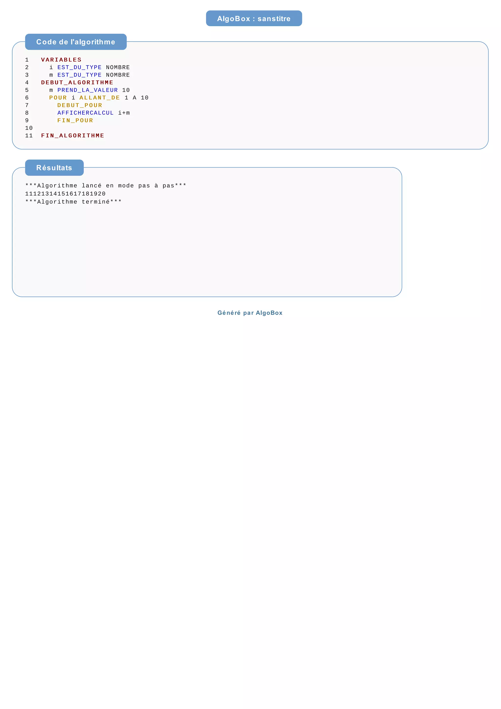 Le document présente un algorithme simple qui additionne un nombre fixe, 10, à une valeur de 1 à 10. Il utilise une boucle pour afficher le résultat de cette addition à chaque itération. L'algorithme est conçu pour être exécuté en mode pas à pas.