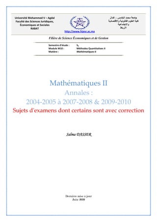 Le document présente un cours de mathématiques II, axé sur l'algèbre linéaire et le calcul matriciel, au sein de la filière de sciences économiques à l'Université Mohammed V d'Agdal. Il détaille le contenu des chapitres incluant les espaces vectoriels, les applications linéaires, les matrices, les déterminants et les systèmes linéaires, ainsi que des informations sur les évaluations. Les annales des examens de 2004 à 2010 avec corrections sont également fournies pour aider les étudiants dans leur préparation.