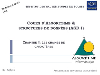 Le document est un cours sur les algorithmes et les structures de données, mettant l'accent sur les types de caractères et de chaînes de caractères. Il couvre la déclaration, les opérations, les procédures standards, et présente divers exercices pratiques pour renforcer l'apprentissage. Les concepts abordés incluent la manipulation de chaînes, la comparaison de caractères, et la vérification de palindromes.