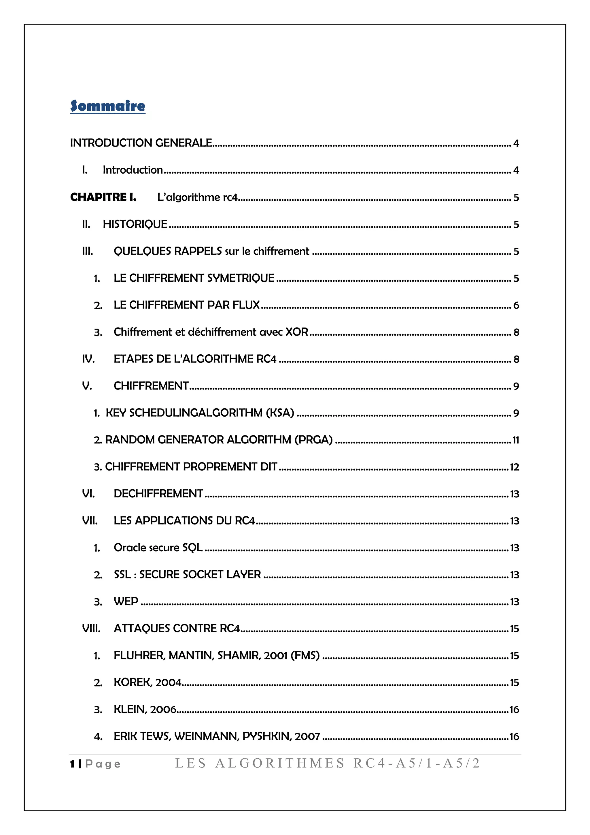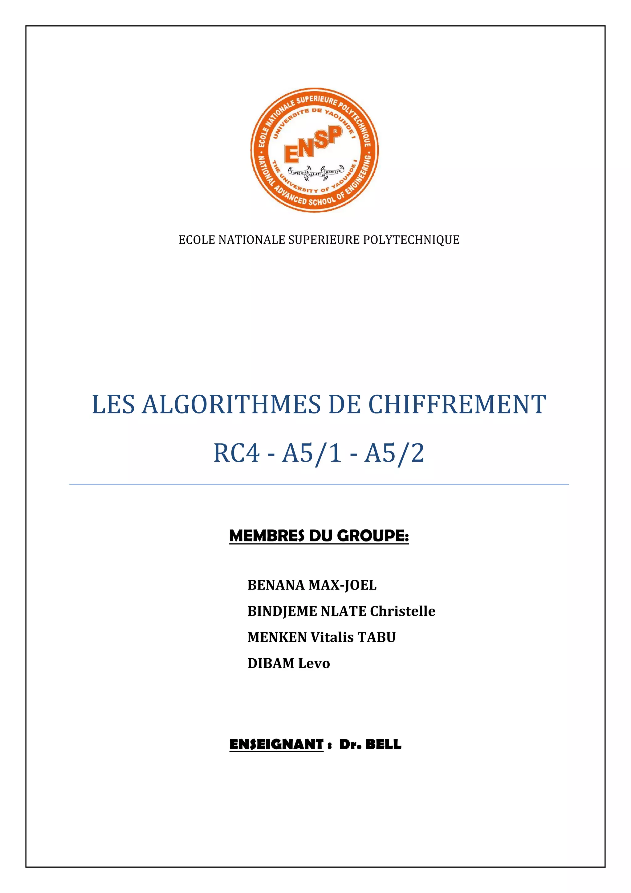 Le document traite des algorithmes de chiffrement RC4, A5/1 et A5/2, en explorant leurs principes de fonctionnement, leurs étapes de chiffrement, ainsi que leurs applications pratiques dans le domaine de la sécurité des données. Il examine également l'historique, les attaques potentielles contre ces algorithmes, ainsi que leurs avantages et inconvénients. Le premier chapitre est principalement consacré à l'algorithme RC4, tandis que le second aborde les systèmes de chiffrement A5, utilisés notamment dans les communications GSM.