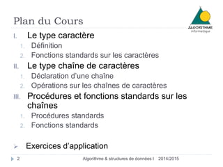 Le document présente un cours sur les chaînes de caractères dans le cadre des algorithmes et des structures de données. Il couvre les définitions, les opérations, les procédures et les exercices d'application relatifs aux caractères et aux chaînes, en utilisant des exemples pratiques. Les thématiques incluent la manipulation de caractères ASCII, la concaténation de chaînes, et la vérification de palindromes.