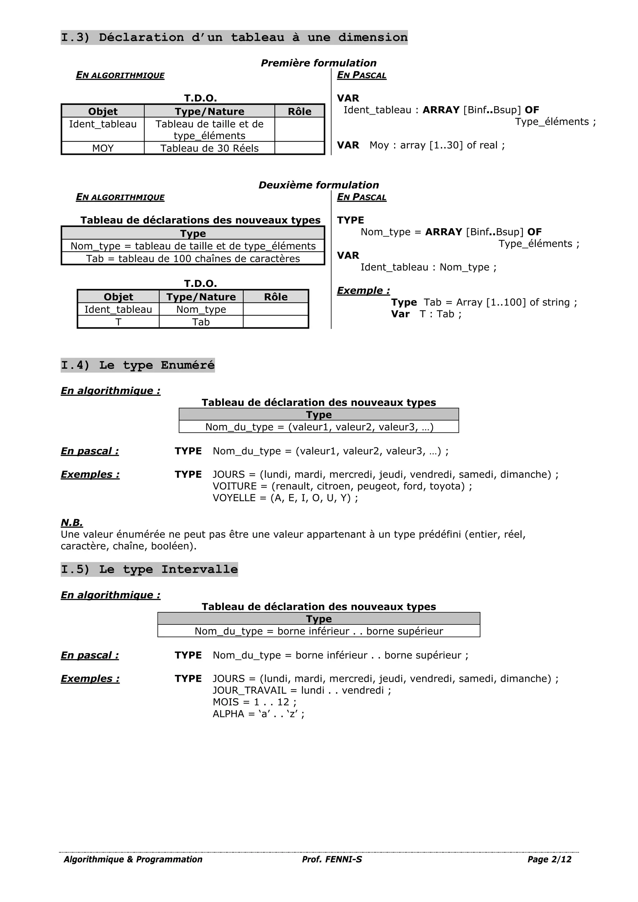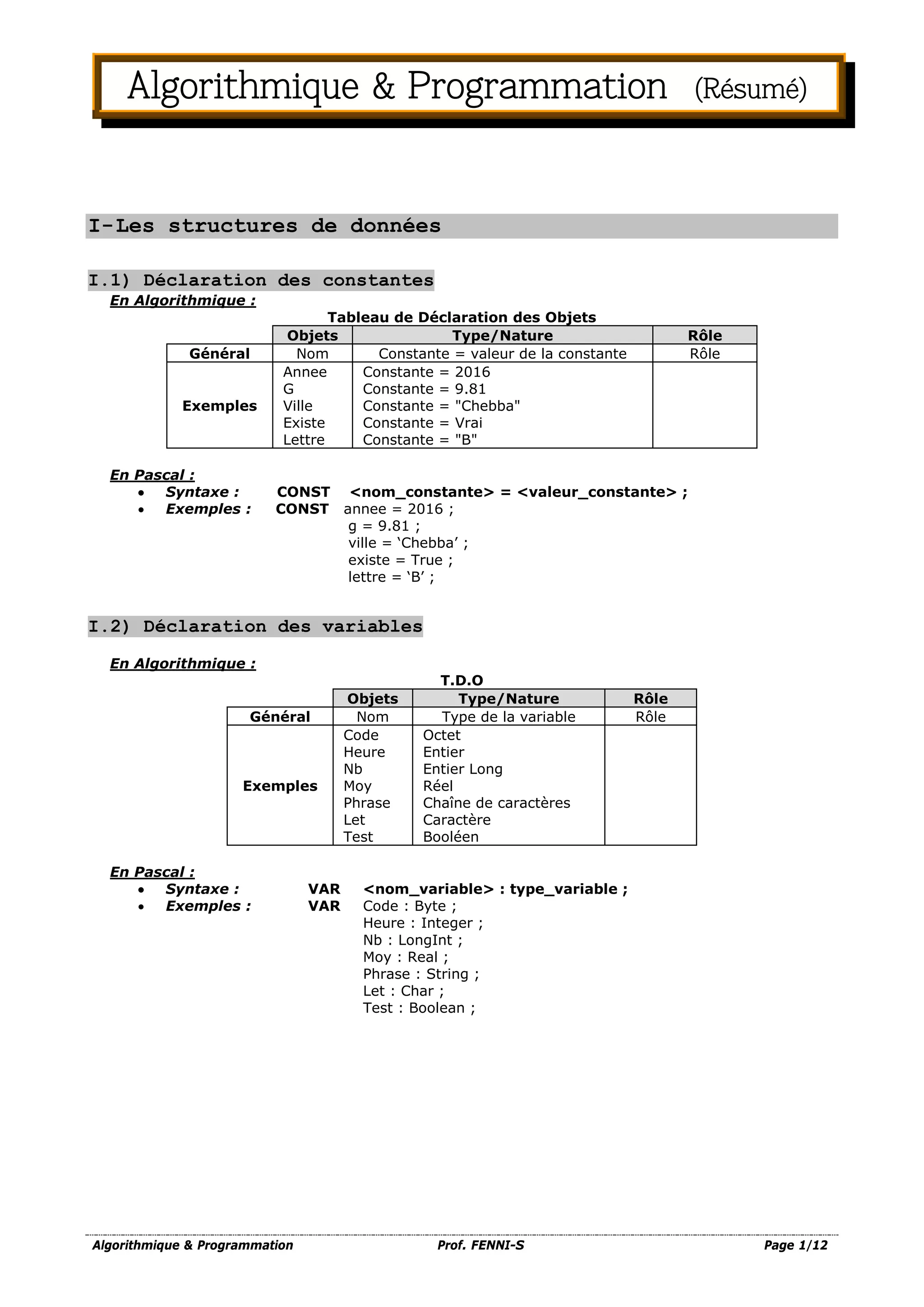 Le document traite de l'algorithmique et de la programmation, en fournissant des résumés des structures de données, des types de variables, des tableaux, des opérations d'entrée/sortie, et des structures de contrôle conditionnelles et itératives. Il explique également les procédures et les fonctions standard telles que celles relatives aux chaînes de caractères. Des exemples en langage Pascal sont utilisés pour illustrer chaque concept.