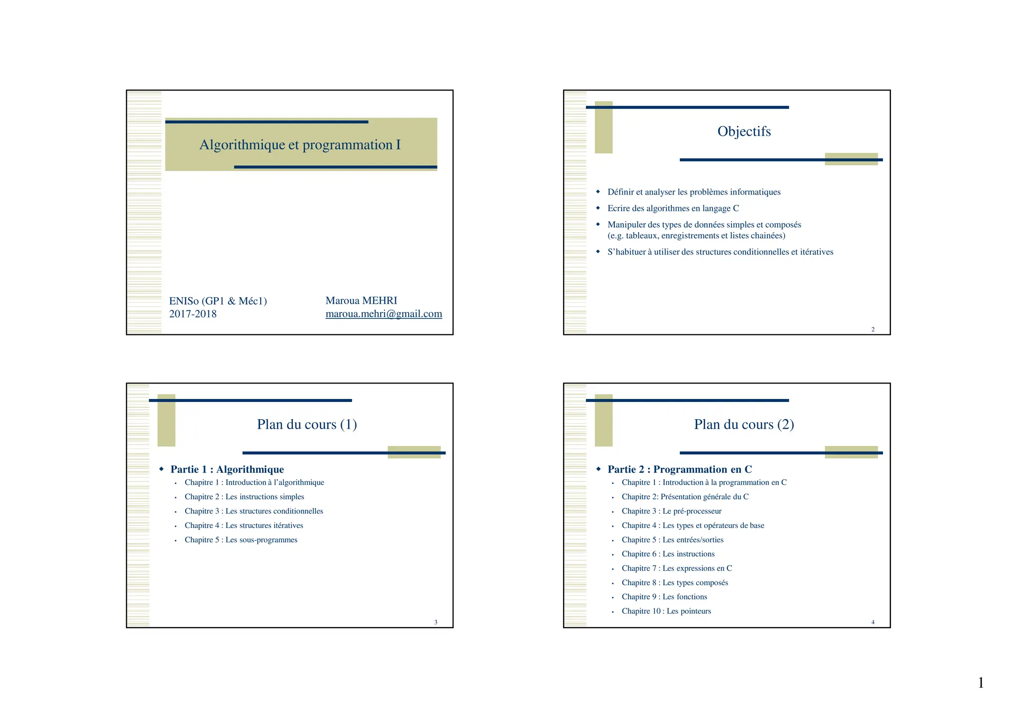 Le document présente un cours sur l'algorithmique et la programmation en C, abordant les concepts de base tels que les algorithmes, les structures conditionnelles et itératives, ainsi que la définition et l'analyse de problèmes. Il détaille les étapes de résolution des problèmes informatiques, y compris l'écriture d'algorithmes, la programmation et les tests. En outre, il fournit une bibliographie de références pour approfondir le sujet.