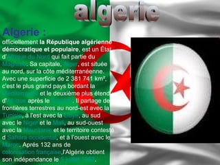 L'Algérie, officiellement la République algérienne démocratique et populaire, est le plus grand pays méditerranéen et le deuxième d'Afrique. Indépendante depuis le 5 juillet 1962 après 132 ans de colonisation française, elle est membre de plusieurs organisations internationales. Le nom 'Algérie' provient de la ville d'Alger, qui a été fondée au 10ème siècle.