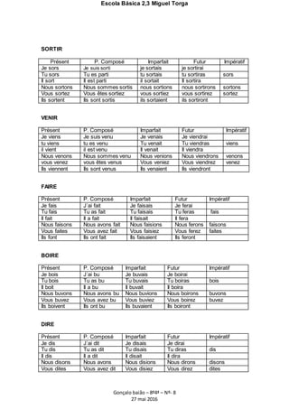 Le document est un tableau des conjugaisons de divers verbes en français aux temps du présent, passé composé, imparfait, futur et impératif. Il inclut des exemples pour les verbes 'être', 'avoir', 'aimer', 'aller', 'finir', 'sortir', 'venir', 'faire', 'boire' et 'dire'. Chaque verbe est présenté avec ses différentes formes pour chaque pronom sujet.