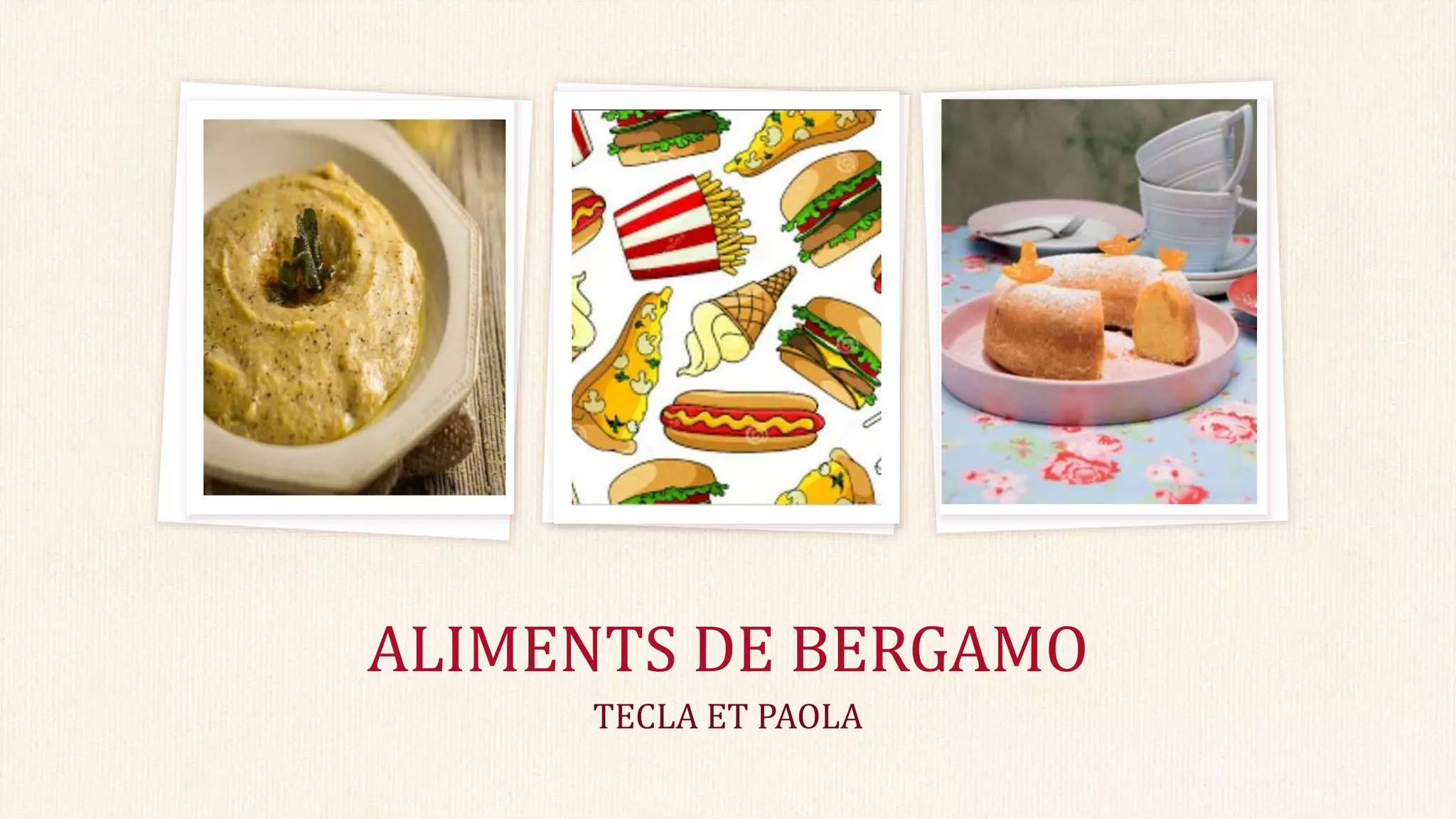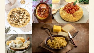 Le document présente deux recettes d'aliments typiques de Bergamo : la polenta taragna et la torta Donizzetti. La recette de polenta taragna nécessite 500 gr de farine de polenta, du sel, du fromage, de l'eau, du beurre et de l'huile. La torta Donizzetti comprend de la fécule de pomme de terre, de la farine, du sucre, des jaunes et blancs d'œufs, du beurre, du jus de citron, de la vanilline et du sucre glacé.