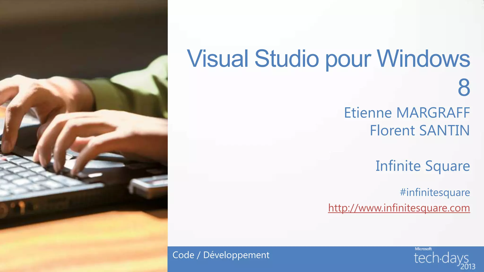 Le document présente Infinite Square, une société spécialisée dans le développement d'applications sur la plateforme Microsoft, et aborde les défis et les meilleures pratiques liés à la création d'applications pour Windows 8. Il souligne l'importance d'une bonne organisation, d'une méthode adaptée, et de l'utilisation d'outils tels que Visual Studio pour garantir la qualité des projets. Les pièges à éviter et les ingrédients pour réussir un projet sont également discutés, notamment l'importance des user stories et des tests structurés.