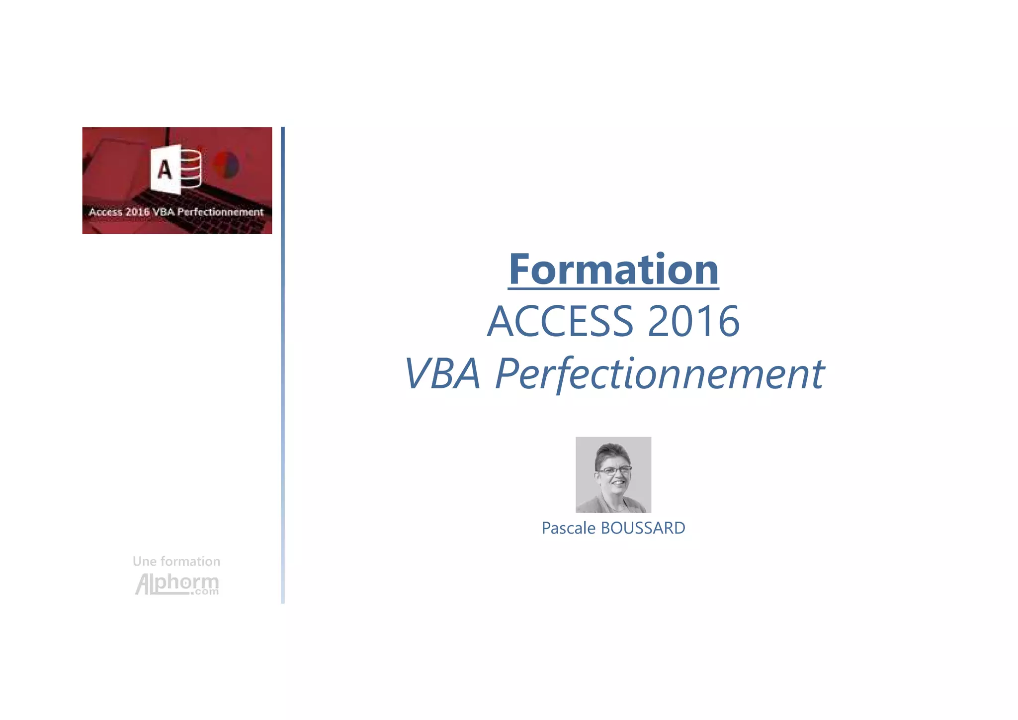 La formation Access 2016 VBA perfectionnement, animée par Pascale Boussard, vise à développer des compétences avancées en VBA, notamment la gestion des erreurs, l'accès aux données via DAO et ADO, et la création de formulaires et états avancés. Elle est destinée aux concepteurs et utilisateurs de bases de données expérimentés souhaitant personnaliser les fonctionnalités d'Access. Le programme inclut des travaux pratiques et des projets pour renforcer l'apprentissage des concepts abordés.