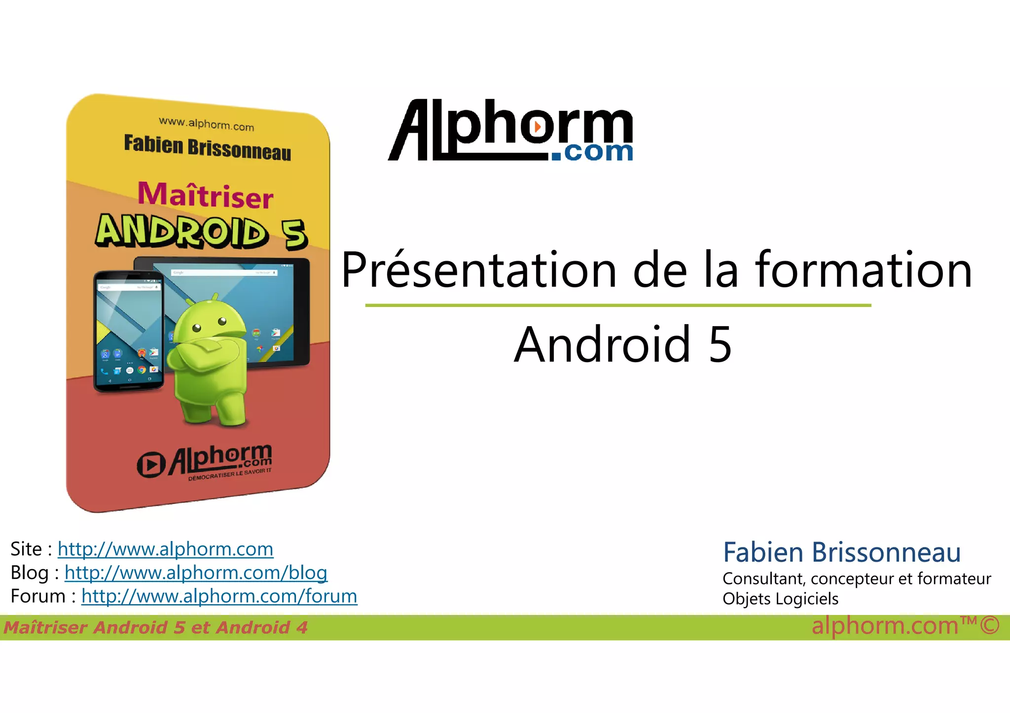 Ce document présente un cours sur la maîtrise des plateformes Android 4 et 5, couvrant des concepts essentiels tels que l'utilisation de l'environnement de développement Android Studio, la gestion des interfaces utilisateurs, le stockage d'informations, et la gestion du multimédia. Le formateur, Fabien Brissonneau, prodigue également des conseils sur le déploiement d'applications, la gestion des versions et les outils associés au développement Android. Le cours s'adresse principalement aux développeurs déjà familiers avec Java.
