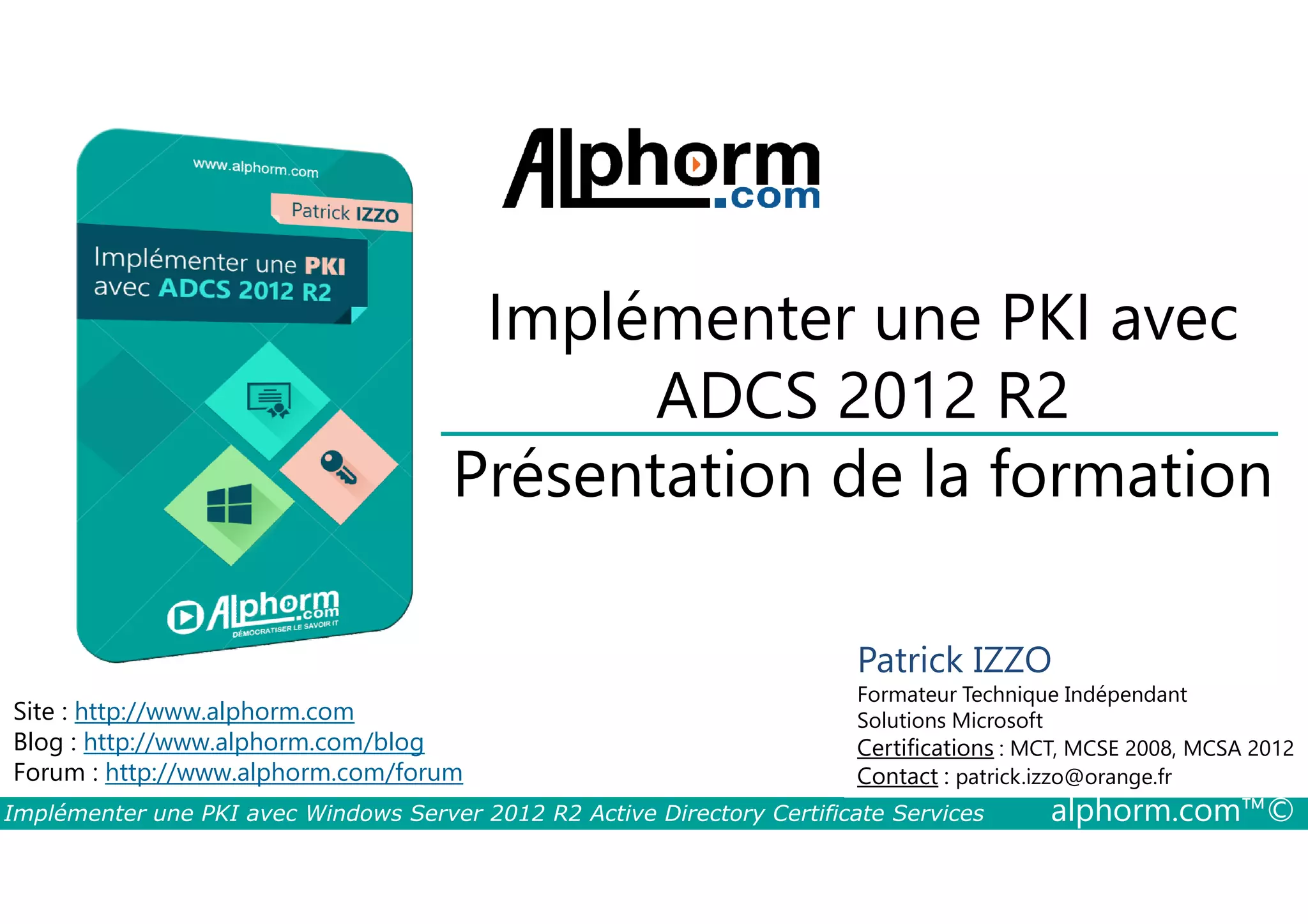Le document présente une formation sur l'implémentation d'une infrastructure à clés publiques (PKI) avec Windows Server 2012 R2, animée par Patrick Izzo, un formateur technique indépendant. Il aborde les concepts fondamentaux de la cryptographie, les composants de la PKI et les pratiques nécessaires à la sécurisation des systèmes d'information. Le contenu inclut des ateliers pratiques et des connaissances prérequises pour les professionnels concernés par la sécurité informatique.