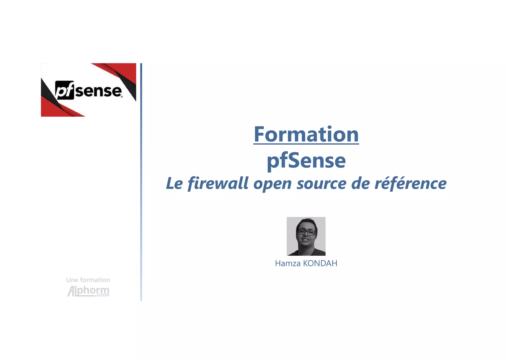 Ce document présente une formation sur le firewall open source pfSense, en abordant son installation, sa configuration et ses fonctionnalités, incluant la gestion des VLANs, le firewalling, les VPNs et la qualité de service. Il cible des professionnels des réseaux tels que les administrateurs, techniciens et ingénieurs réseau, et propose des scénarios de déploiement ainsi qu'une architecture de laboratoire pour des exercices pratiques. La formation met l'accent sur les prérequis en réseaux, les politiques de sécurité et les meilleures pratiques pour une infrastructure réseau efficace.